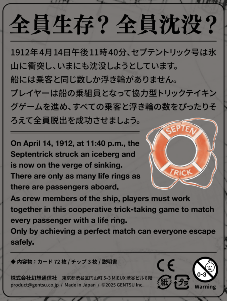 Septentrick is a cooperative trick-taking game where players are working together to rescue passengers on a sinking boat. As crew members of the ship, players must work together to match every passenger with a life ring. Only by achieving a perfect match can everyone escape safely!